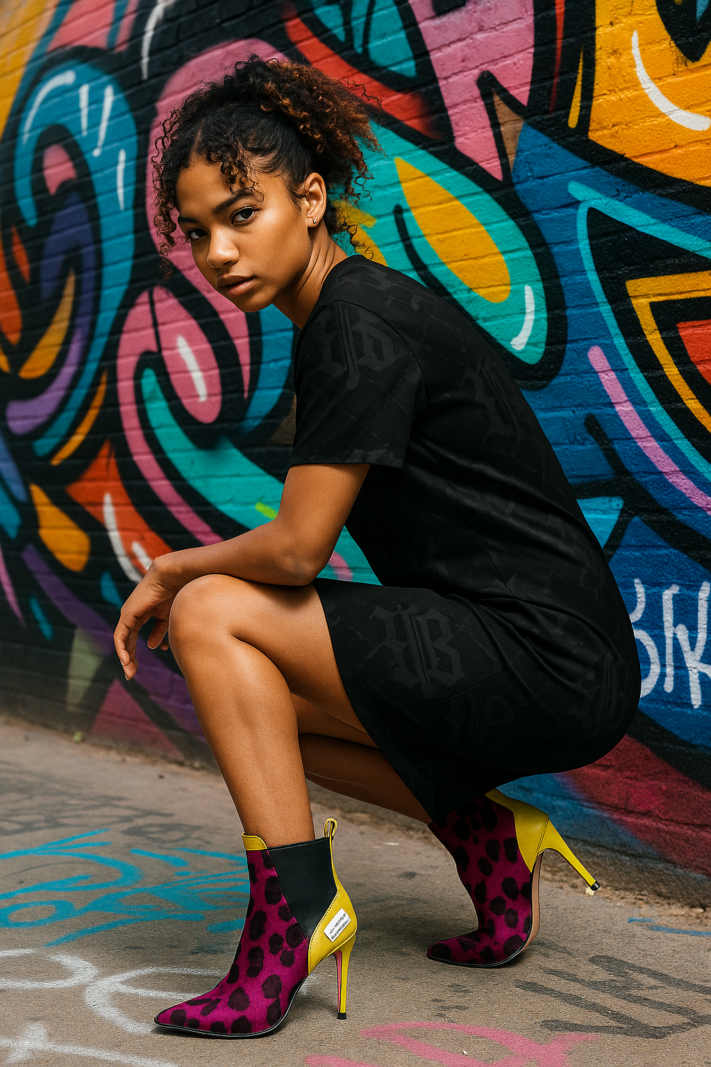 Light up the scene in the YBP “Kilo-Watt”—a daring fusion of elegance and edge, designed by Collin Gibson and handcrafted in Italy. This custom stiletto commands attention with a fuchsia ostrich-print toe, striking gold accents, and a sculpted 10.5 cm (4.1”) stiletto heel. Sophisticated and unapologetic, this heel is built for women who don’t just enter the room—they short circuit it.